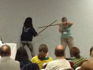 “The Pen vs the Sword” (“Writers who also happen to be swordfighters discuss the myths and realities of the sword in fiction – and demonstrate their skills with the blade!”) featured Marc Aplin as moderator, with Fran Terminiello, Juliet E. McKenna, Adrian Tchaikovsky and Clifford Beale on the panel. The discussion was fascinating, and extremely useful for anyone whose fiction features people fighting with melee weapons. (So pretty much everyone at FantasyCon!)